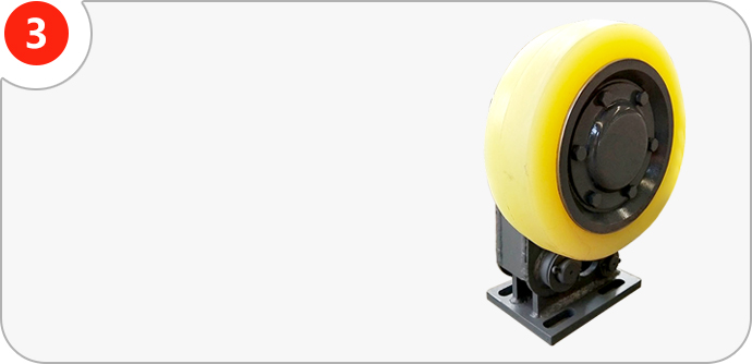 滚轮受力通过支架、调节套、调节螺杆、碟簧轴施力于碟簧上,通过碟簧轴上、下运动释放和压缩碟黄组实现缓冲。